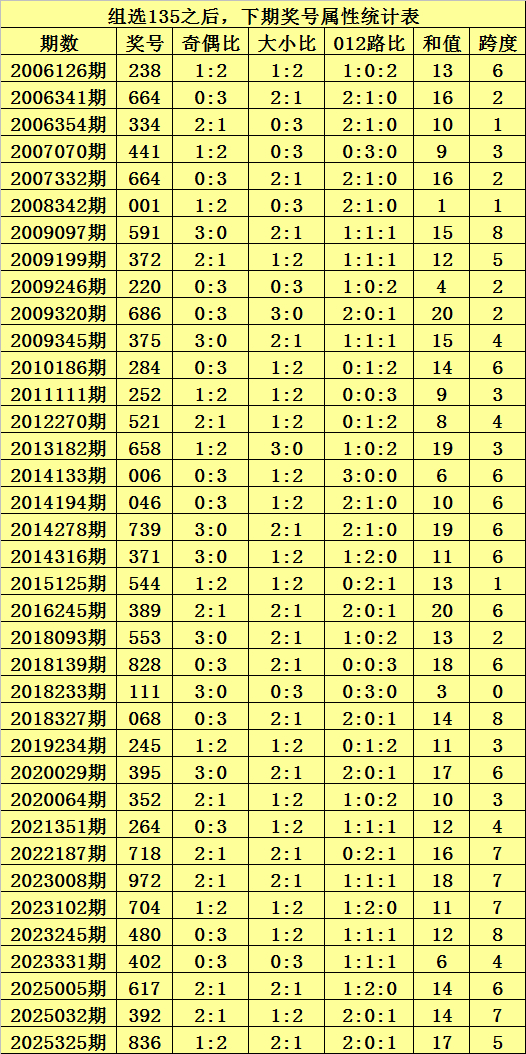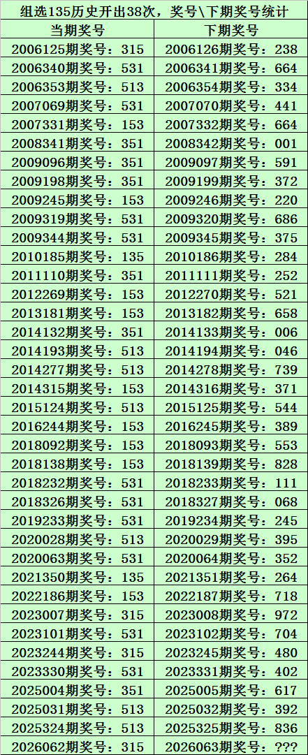 上期精良:陈列三第2026062期奖号为:315,类型:组六,历史上直选号码315出现了4次,组选号码135出现了38次。