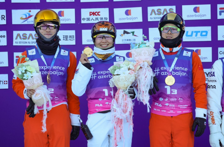 新华社像片,张家口(河北),2025年12月21日 12月21日,冠军中国一队选手徐梦桃(中)、李天马(左)和皆广璞在受奖庆典上。 当日,国外雪联解放式滑雪空中妙技世界杯(云顶站)羼杂团体项目比赛在河北省张家口市崇礼区云顶滑雪场进行。 新华社发(武殿森摄)