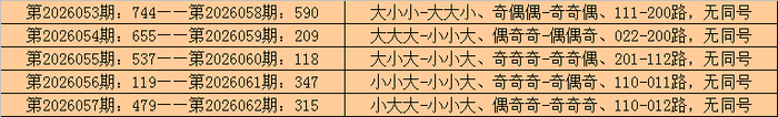 在成列三历史开奖中,第2026053期-第2026057期长入5期奖号为:744-655-537-119-479。