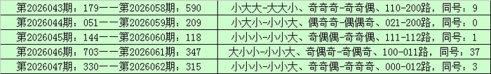 成列三第2026058期-第2026062期长入5期奖号为:590-209-118-347-315。