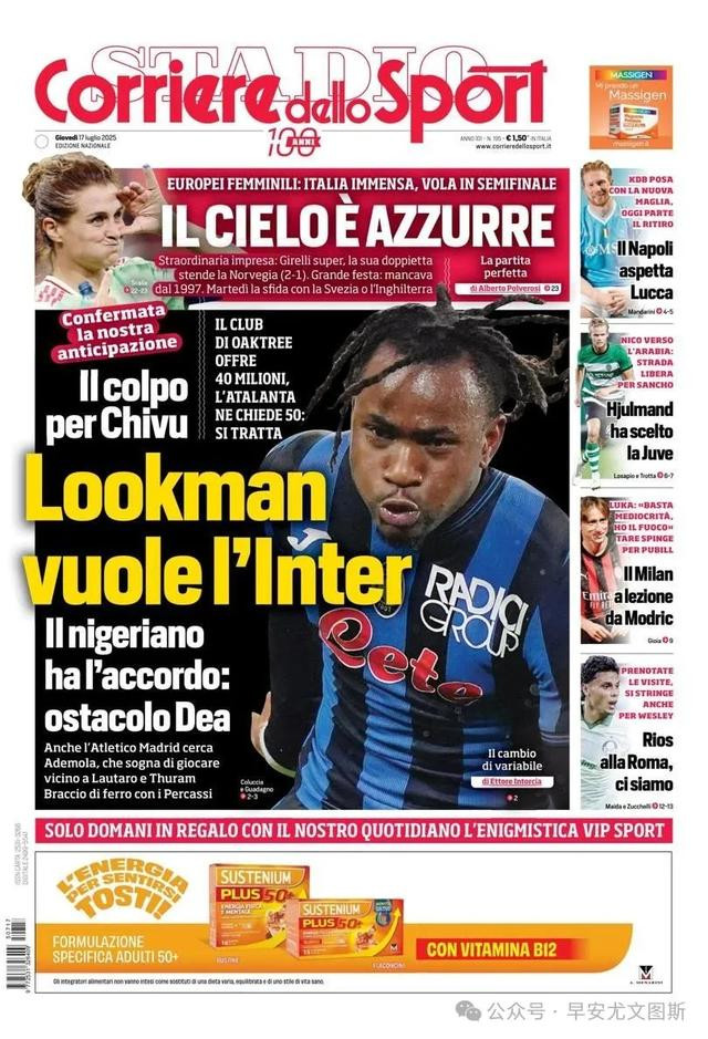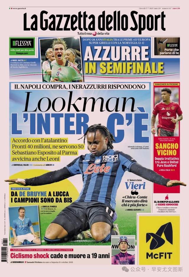 2、卢克曼,国米来了。那不勒斯买东谈主,蓝黑军团作出复兴。与这名亚特兰大先锋兑现左券,准备4000万,但需要5000万。塞巴斯蒂亚诺-埃斯波西托前去帕尔马,莱奥尼更近了。