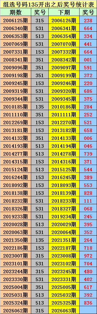 摆列三组选135出现之后下期别离开出:238、664、334、441、664、001、591、372、220、686、375、284、252、521、658、006、046、739、371、544、389、553、828、111、068、245、395、352、264、718、972、704、480、402、617、392、836。