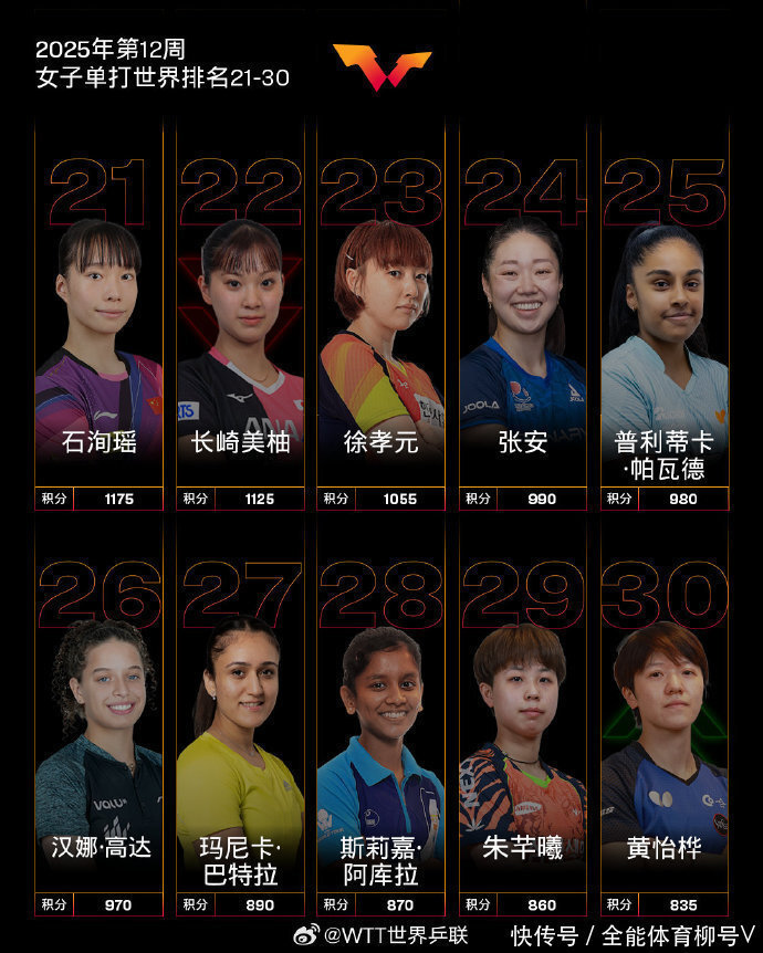北京技术3月19日讯息,跟着2025年WTT重庆冠军赛圆满闭幕,外洋乒联2025年第12周天下排行也火热出炉。女子单打方面体育最新信息,中国队包揽前四,夺得本站冠军的“小魔王”孙颖莎进一步安详天下第一的排行,鳗鱼本王曼昱依旧排在第二。